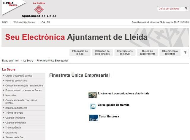 La Generalitat de Catalunya, a través del Departament d’Empresa i Coneixement, ha reconegut l’Ajuntament de Lleida amb el distintiu de la Finestreta Única Empresarial, que pretén simplificar i agilitar els procediments per poder iniciar l’activitat empresarial i dotar-los de més transparència. Amb la implantació d’aquest nou model, la Paeria mostra el seu compromís en l’impuls econòmic dels emprenedors i empresaris de la ciutat. Alhora, dóna compliment al que disposa la llei 16/2015 que, entre altres, fomenta l’activitat econòmica, redueix els tràmits administratius, incrementa la transparència i promou els mecanismes de col·laboració.
