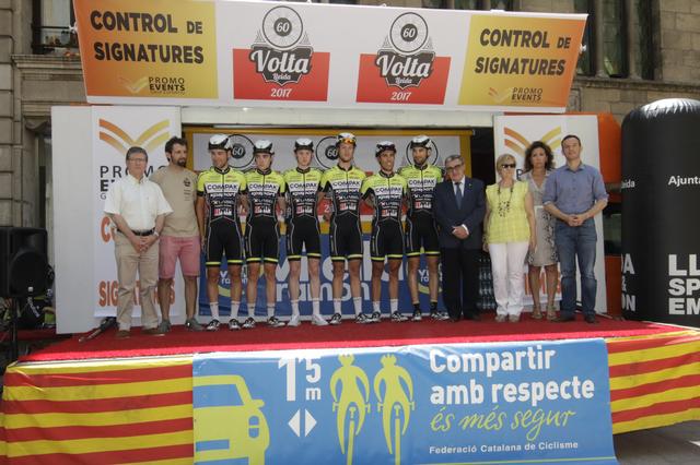 Abans de donar-se la sortida a la primera etapa, el paer en cap, acompanyat de la tinent d’alcalde Montse Parra i Sergi Escobar, ha assistit al control de signatures i presentació dels equips ubicat a la plaça Paeria. També han assistit els regidors Marta Gispert, José Luis Osorio, Joan Vilella