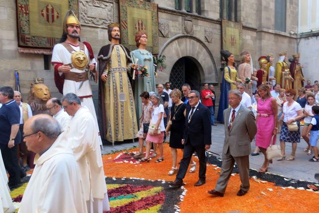 El paer en cap participa en la processó que presideix el bisbe Salvador i que ha transitat des de la Catedral Nova fins a la plaça de Sant Joan, pels carrers de l’Eix, engalanats amb catifes de flors i serradures de colors