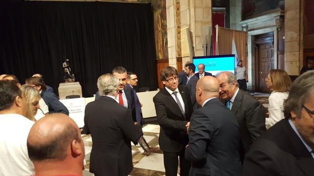 El president de la Generalitat, Carles Puigdemont, acompanyat del conseller d’Empresa i Coneixement, Santi Vila, ha presidit la signatura del Pacte Nacional per a la Indústria amb els agents econòmics i socials, en un acte que s’ha celebrat al Saló Sant Jordi del Palau de la Generalitat. El tinent d’alcalde i regidor de Promoció de la Ciutat, del Comerç, del Turisme i de l’Ocupació i l’Emprenedoria, Rafael Peris, ha assistit a l’acte.