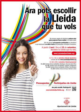 -A partir de demà, 1 de setembre i fins el dia 11, totes les persones empadronades a Lleida majors de 16 anys a data de 15 de setembre podran votar la web www.LaLleidaQueTuVols.org -Del 12 al 15 de setembre es podrà votar presencialment als centres cívics de Balàfia, Pardinyes, Secà de Sant Pere, La Bordeta, Cappont, Magraners, Mariola, l’Ereta, Democràcia, Sucs, Raimat i Llívia -Es podran votar 103 projectes, 29 de majors i 74 menors. -Demà comença una campanya de publicitat institucional on s’expliquen els mecanismes per participar-hi amb el web www.LaLleidaQueTuVols.org com a referència d'informació i votació