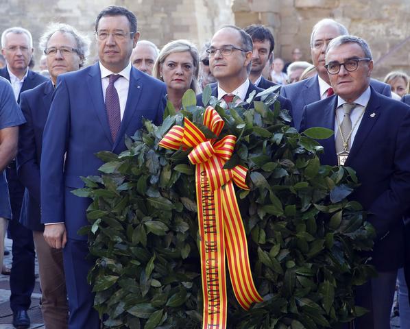 Ha participat amb el conseller Jordi Turull en l’ofrena floral que han tingut lloc davant el Pont Llevadís del recinte de la Seu Vella