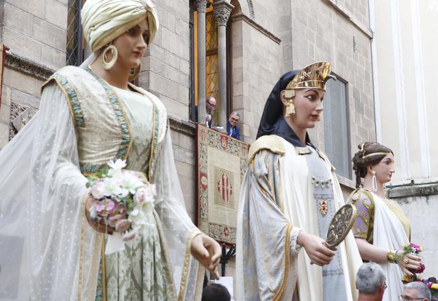 Abans del pregó, els Gegants han arribat fins a la plaça de la Paeria envoltats de nombroses famílies i nens i nenes que els esperaven amb la il·lusió de veure’ls de prop i gaudir dels seus balls. Els Gegants, que han sortit del Pati dels Comèdies, anaven acompanyats de la Ilerband.