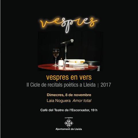 Laia Noguera oferirà el recital “Amor Total” el dimecres, dia 8 de novembre, al Cafè del Teatre. La lectura poètica anirà precedida per un breu clip audiovisual sobre l’autora, que atansarà al públic la seva biografia, el seu pensament i les seves reflexions com a creadora.