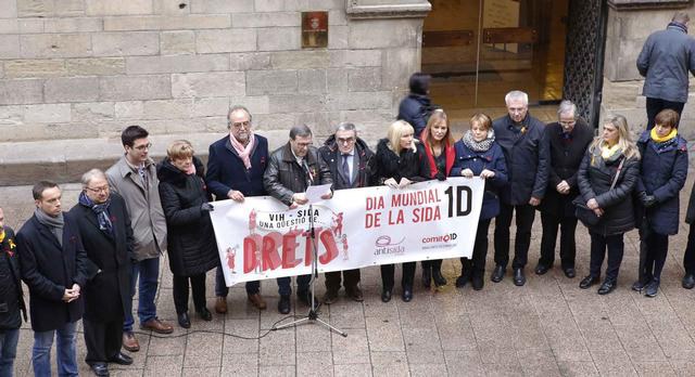 L’alcalde Àngel Ros assisteix a la lectura del manifest que s’ha realitzat aquest migdia a la plaça Paeria on s’ha desplegat un llaç vermell Aquest vespre, l’Ajuntament il·luminarà la façana de la Paeria de vermell en solidaritat amb la diada