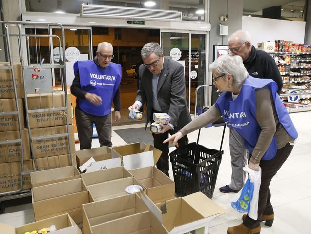 El paer en cap, acompanyat pel president del Banc dels Aliments de Lleida, Jeroni Saura, ha efectuat la compra en un supermercat de la ciutat i l’ha lliurat tot seguit en el punt de recollida habilitat pels voluntaris de la campanya dins del mateix establiment.