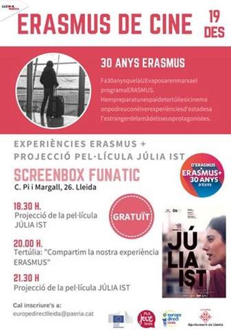 Per iniciativa de l’Ajuntament de Lleida, l’Screenbox Funàtic acollirà el dimarts 19 de desembre un espai de tertúlies d’experiències sobre les oportunitats que ofereix el programa europeu de formació ERASMUS+ juntament amb la projecció del film ‘Júlia Ist”