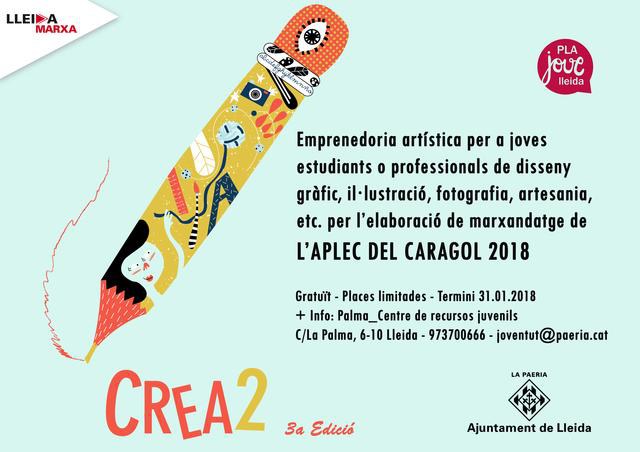 El Departament de Joventut de la Paeria ha impulsat la 3a edició del projecte CREA2 amb l’objectiu de promoure l’emprenedoria artística. El projecte consisteix en un acompanyament professional a càrrec del professor i l’enginyer de producte Guillem Ferran als joves seleccionats, per dissenyar de manera individual o en col·laboració amb altres participants (unint diferents disciplines) marxandatge de l’Aplec del Cargol. Per desenvolupar el projecte, Joventut compta amb la col·laboració de la Federació de Colles de l'Aplec del Caragol, la FECOLL, que s’ha mostrat interessada a comprar els productes resultants, si encaixen amb les seves necessitats, i amb la previsió que els treballs estiguin realitzats a finals d’abril.