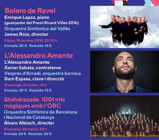 El primer concert es celebrarà el proper dijous, 15 de març a les 20.30 h amb l’Orquestra Simfònica del Vallès i el guanyador del concurs de piano Ricard Viñes 2016, Enrique Lapaz, un pianista d'alt nivell i sensibilitat. En aquest cas interpretaran el Bolero de Ravel i The piano obra cinematogràfica de Michael Nyman.