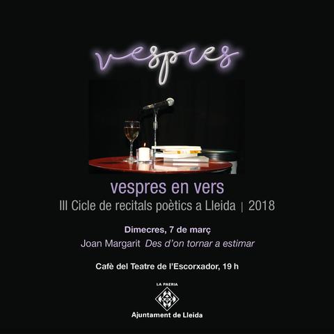 El cicle de recitals poètics a Lleida “Vespres en Vers” arriba enguany a la seva tercera edició, amb l’objectiu d’oferir l’oportunitat de sentir en la pròpia veu dels poetes les seves creacions en vers. Vespres en Vers 2018 s’estrena amb la lectura poètica de Joan Margarit, que oferirà el recorregut pels seus poemes sota el títol “Des d’on tornar a estimar”. La cita és demà dimecres, a les 7 del vespre, al Cafè del Teatre de l’Escorxador de Lleida, amb accés lliure i gratuït.