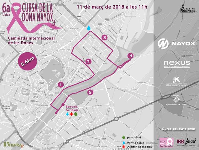 La Guàrdia Urbana de Lleida vetllarà pel bon funcionament del trànsit durant la 6a Cursa de la Dona Nayox, que té lloc aquest diumenge. Aquest esdeveniment esportiu promou la pràctica de l’esport femení i recapta fons per al lluita contra el càncer de mama, a través de la Beca Marta Santamaria. El recorregut, de 5,6 quilòmetres es pot fer en format cursa o caminada. La sortida està prevista a les 11 h i la finalització, a les 13 h aproximadament. L’itinerari de la Cursa és: Marge esquerra del riu –lateral Pl. Blas Infante- (sortida), marge esquerra del riu fins rampa d’accés al Camí de Granyena, Camí Granyena, Pont de Pardinyes, Av. Tortosa, Corregidor Escofet, Comtes d’Urgell, Princep de Viana (sentit Victoriano Muñoz), sortida/baixada Av. Del Segre, Av. Del Segre (sentit Ajuntament), Pl. Agelet i Garriga, Blondel, Passarel·la del Liceu Escolar, baixada a Marge esquerra del riu –lateral Pl. Blas Infante- (arribada).