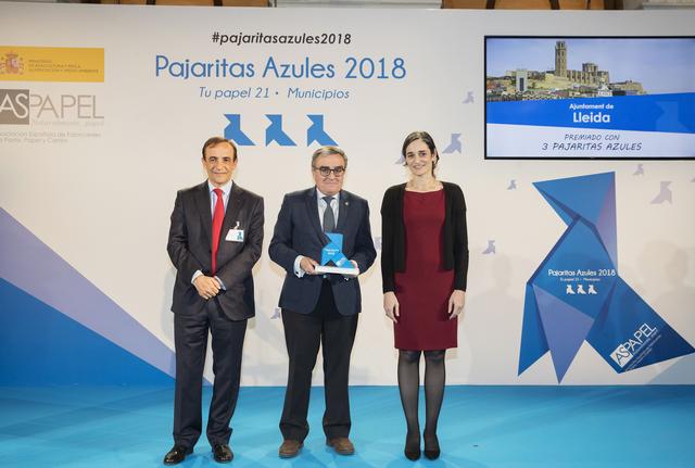 L’alcalde, Àngel Ros, ha recollit avui a Madrid el guardó “Tres Pajaritas Azules”, que concedeix la patronal del sector del paper i cartró i que la ciutat obté per segon anyLa Paeria és l'únic ajuntament català que rep enguany la màxima categoria d'aquesta distinció, que reconeix la millora en tractament de residus gràcies a iniciatives com la implantació de la recollida porta a porta, una campanya de sensibilització i una nova distribució de les illes de contenidors