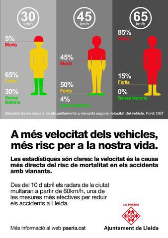 L’Ajuntament de Lleida iniciarà una campanya de divulgació el proper dilluns 26 de març per informar la ciutadania del nou llindar de velocitat a què multaran els radars de la ciutat. Sota el lema “A més velocitat dels vehicles, més risc per a la nostra vida”, la campanya se centrarà en anuncis adreçats a conscienciar de la relació directa entre la velocitat i l’augment de la lesitivitat. Segons les dades de la DGT, a una velocitat de 30 km/h la probabilitat de no patir lesions és d’un 30%, de resultar ferit un 65% i hi ha un 5% de possibilitats de morir. Un accident a una velocitat de 45 km/h suposa un 4% de possibilitats de no patir lesions, un 50% de resultar ferit i un 45% d’esdevenir un accident mortal. Un vehicle que circula a 65km/h té un 15% de possibilitats de provocar ferits i un 85% que aquestes ferides siguin d’extrema gravetat i provoquin la mort.