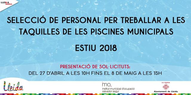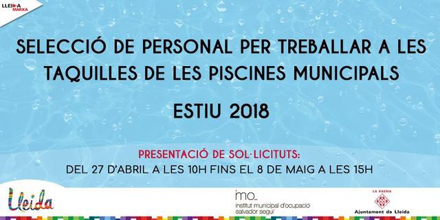 L’Ajuntament de Lleida ofereix 33 places per treballar aquest estiu a les taquilles de les piscines municipals. La convocatòria de selecció de personal ja està publicada i el termini per presentar les sol·licituds es tanca el dimarts 8 de maig a les 15 h. Les persones interessades poden presentar la documentació necessària a l’Institut Municipal d’Ocupació (IMO).