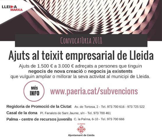 L’Ajuntament de Lleida ha obert la nova convocatòria 2018 de la línia d’ajuts al teixit empresarial que té com a objectiu principal la creació d’ocupació a la ciutat. La convocatòria d’enguany, que pretén donar un salt qualitatiu i ajudar els empresaris que puguin tirar endavant la seva activitat, incorpora novetats importants com és l’augment fins als 150.000€ de la partida del pressupost que es destinarà a aquesta línia (l’any passat era de 100.000€), així com ajuts que també incrementen i passen a ser d’entre 1.500 i 3.000 euros a fons perdut per a noves iniciatives o projectes ja existents que vulguin ampliar o millorar la seva activitat.