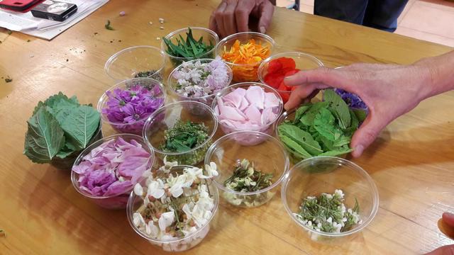 Al llarg del taller també s’han explicat una sèrie de receptes culinàries: Truita de colitxos, Malva al vapor, Amanida de flors, Llesques de colors, Tempura de borratja o de fonoll, Paté vegetal o Xampany i bunyols de flors de Saüc.