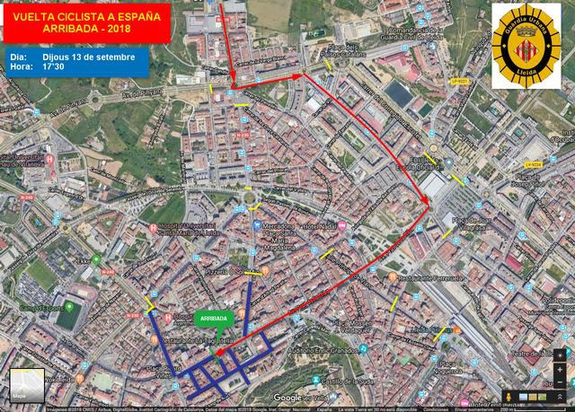 La 18a etapa, entre Ejea de los Caballeros i Lleida, recorrerà 186,1 km i la línia de meta es situarà a l’avinguda Prat de la Riba, a l’alçada del carrer Teuleries. Els ciclistes hi arribaran després d’accedir a la ciutat per la carretera N-230, Alcalde Porqueres, avinguda de Balàfia, Baró de Maials i Prat de la Riba, sent l’horari previst d’arribada les 17.40 hores, aproximadament. Aquests carrers s’aniran tallant progressivament al trànsit i els agents de la Guàrdia Urbana, que també comptaran amb la col·laboració de voluntaris de Protecció Civil, desviaran als vehicles per recorreguts alternatius.