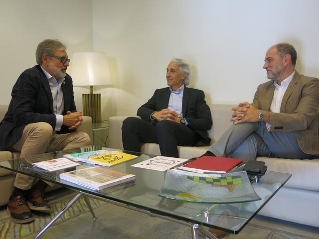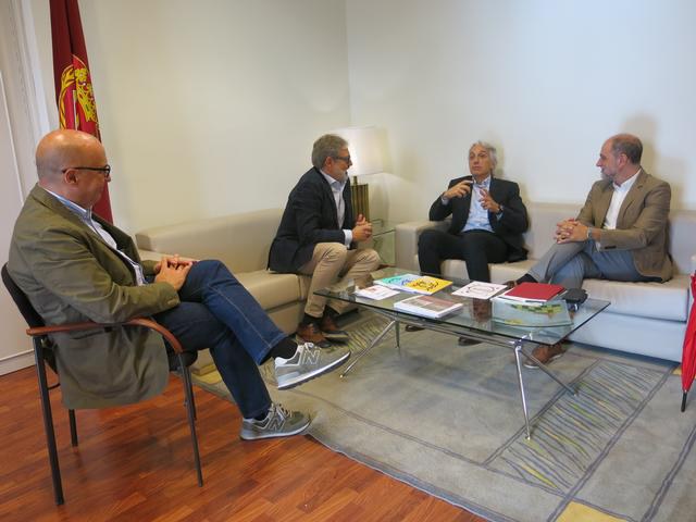 L’alcalde de Lleida, Fèlix Larrosa, acompanyat del tinent d’alcalde i regidor de Promoció de la Ciutat, del Comerç, del Turisme i de l’Ocupació i l’Emprenedoria, Rafael Peris, ha mantingut avui una trobada amb el President de GlobaLleida, Ramon Roca, i amb el seu conseller delegat, Oriol Oró, amb l’objectiu de repassar l’activitat de l’ens i posar sobre la taula temes com la captació d’inversions per a Lleida, una de les prioritats de l’actual paer en cap i el seu equip de govern.