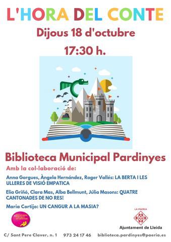 L’activitat “L’Hora del conte” torna aquest dijous a la Biblioteca Municipal de Pardinyes. La sessió és gratuïta, començarà a les 17.30 i s’adreça als infants a partir de 3 anys. "L’Hora del conte" pretén fomentar la lectura entre els més petits a través de la narració oral de contes i es realitza amb voluntaris de la Biblioteca i estudiants de la Universitat de Lleida, en aquest cas de 4t del Grau de Primària. Les narracions es fan amb l’ajuda de representacions, perquè els infants en puguin gaudir i s’interessin per la lectura.