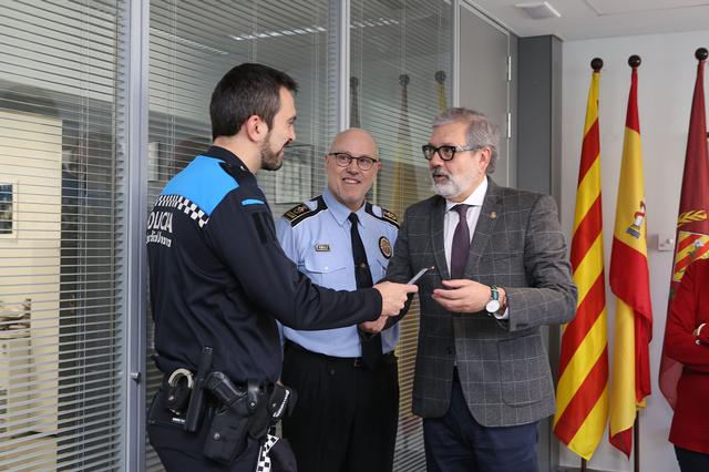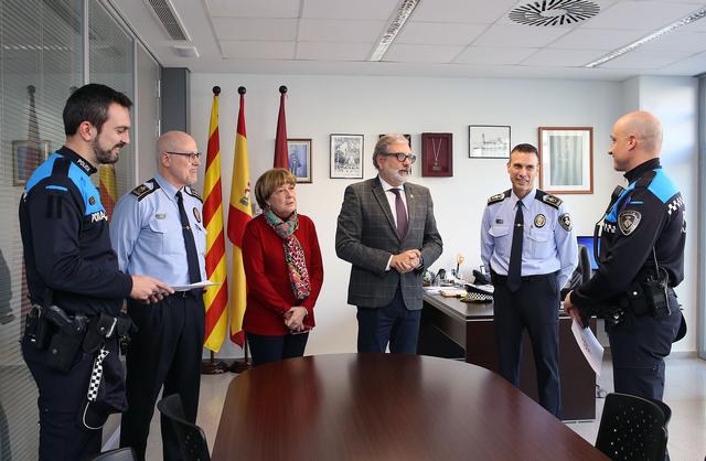 El paer en cap, Fèlix Larrosa, ha saludat els dos nous agents incorporats a la Guàrdia Urbana, que han pres possessió del càrrec, i ha valorat que Lleida compta amb un bon model de Guàrdia Urbana. La Paeria reforçarà el cos amb més agents, impulsarà més patrulles de proximitat i aplicarà mesures innovadores al cos