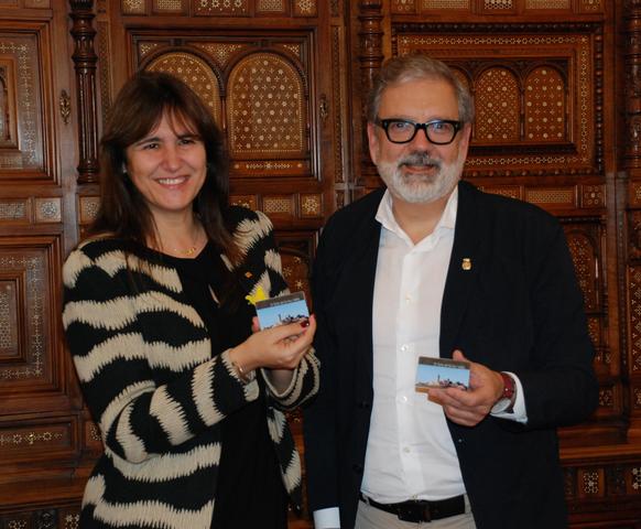 El Paer en Cap Fèlix Larrosa lliura a la consellera de Cultura, Laura Borràs, el dossier definitiu de la candidatura del Turó de la Seu Vella a Patrimoni Mundial de la UNESCO