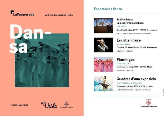 LaTemporada Lleida ha editat un díptic específic amb tota la programació de dansa. Més informació i venda d'entrades a les taquilles dels equipaments, a Turisme de Lleida i al web de LaTemporada