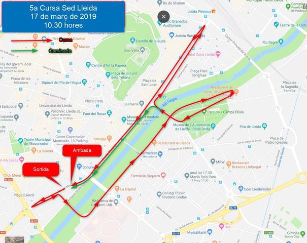 La sortida de la cursa està prevista a l’avinguda de Madrid i transitarà pels següents carrers: Cós-Gayon, República del Paraguai, Passarel·la per incorporar-se al marge esquerre del Riu, Camps Elisis, Pl. Bores, Pont Vell, Rambla Ferran en sentit estació de trens fins a la cruïlla amb Anselm Claver, Rambla Ferran en sentit plaça Espanya, Blondel, plaça. Espanya, Av. Madrid, República del Paraguai, i finalitzarà al pati interior del Col·legi Maristes.