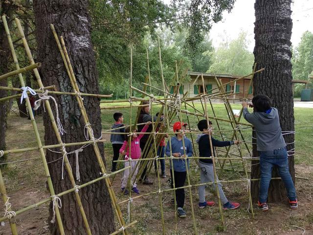 El taller que més expectació ha generat ha estat sens dubte el de construcció de cabanes amb elements naturals, què tot i acollir a 24 infants, ha deixat gent en llista d’espera. La proposta, novetat d’aquesta edició, ha estat guiada per Mireia Martin, arquitecta i educadora, i ha consistit en aprendre les 4 nocions bàsiques de construcció (com unir els elements, com crear les formes desitjades,...) i en elaborar diferents tipus de cabanes de joc a partir de canyes. Els infants han pogut experimentar i treballar amb les canyes i cordes. En aquest taller, els nois i noies han pogut mostrar la seva habilitat i imaginació a l’hora de fer les construccions.