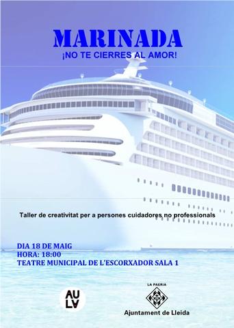 El grup de creativitat format per persones cuidadores de familiars en situació de dependència estrena aquesta tarda l'obra “Marinada (no te cierres al amor)” al Teatre Municipal de l’Escorxador, a les 18 h. Aquest grup sorgeix del taller que inclou el programa de suport a les persones cuidadores no professionals que ofereix la Paeria. El projecte, iniciat el 2015, utilitza el teatre i les seves tècniques interpretatives com a eina d’intervenció comunitària. A més, proporciona als cuidadors no professionals un espai distés i d’expressió lliure, on poder alliberar les emocions i les preocupacions, i reforçar així, l’autoestima i l’apoderament personal.