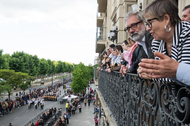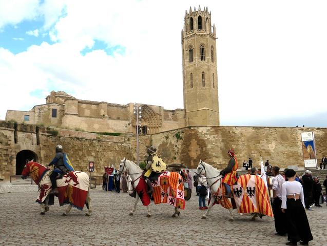 El paer en cap, Fèlix Larrosa i la tinent d’alcalde i regidora de Cultura, Montse Parra, han pujat a la Seu Vella a saludar les diferents comparses abans que iniciessin la desfilada. Després, acompanyats de diversos membres de la Corporació Municipal, ha vist el seguici des del Palau de la Paeria.