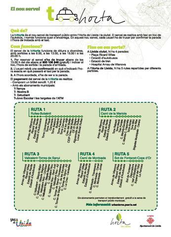 El servei, anomenat T-Horta, compta amb cinc rutes repartides per diferents partides de l’Horta i amb quatre parades a Lleida ciutat Per encarregar el servei s’ha de trucar al telèfon gratuït 900 106 848 i indicar el lloc, l’hora de sortida i la parada d’arribada