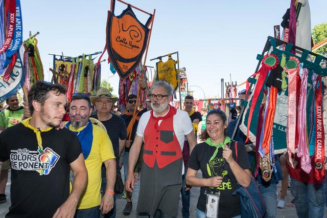 La novetat d’enguany ha estat la ubicació de l’entarimat on les autoritats han anat col·locant les escarapel·les als penons que duien els caps de colla. Fins a l’any passat, aquest quedava instal·lat a la plaça Agelet i Garriga, davant el monument d’Indíbil i Mandoni. Enguany, s’ha escollit la plaça Bores, al costat mateix de l’entrada als Camps Elisis.