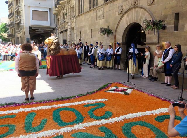 Al migdia, la regidora Jordina Freixanet, acompanyada del també paer Joan Ramon Castro, ha assistit a la sortida de l’Àliga i el Lleó de Lleida del Palau de la Paeria, en l`únic dia de l’any que ho fan, i han presenciat els seus balls de lluïment.