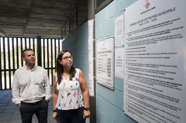 L’alcaldessa accidental, Jordina Freixanet, i el regidor d’Esports, Sergio González, han visitat avui les piscines de Balàfia, i han penjat el cartell informatiu a l’entrada del recinte.