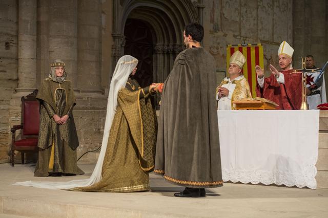 Una història explicada en quatre escenes. La primera s’ha situat als accessos a l’esplanada de la Porta dels Apòstols i ha recreat la vida quotidiana dels lleidatans d’aquella època. La segona escena, davant la Porta dels Apòstols, ha recordat la Batalla de Fraga. La tercera ha escenificat al claustre els capítols matrimonials, que han donat pas a la solemne cerimònia del casament reial a la nau central de la Seu Vella. Finalment, la darrera escena, ha rememorat els Homenatges.