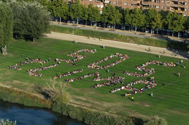 Mig miler de persones es concentren a la canalització del riu i dibuixen sobre la gespa un “SOS Clima"