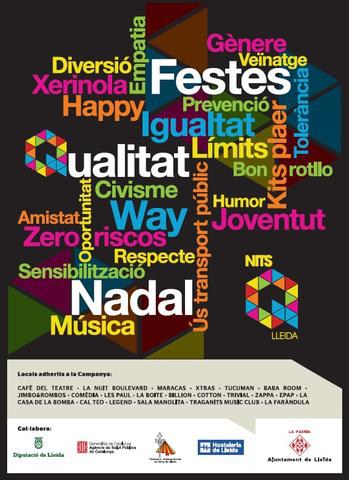 L’Ajuntament de Lleida promou una nova campanya per aquestes festes de Nadal i, especialment, per la nit de Cap d’any, per afavorir unes festes i celebracions atractives, saludables i de més qualitat per a tothom. Un any més, la campanya s’obre al conjunt de les festes de Nadal ja que durant tres setmanes se succeeixen diverses celebracions. Amb el lema “Festes de Nadal amb Qualitat ” es pretén sensibilitzar la població perquè gaudeixi de manera cívica i segura dels moments de lleure i oci. Es posa especial atenció en la nit de Cap d’any, festa que es comparteix per la gran majoria de la ciutadania i on l’espai públic esdevé un entorn festiu i de diversió on cal garantir una bona convivència i civisme entre totes i tots.