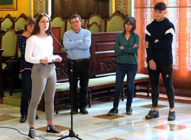 La regidora d’Educació, Cooperació, Drets Civils i Feminismes, Sandra Castro, lliura un diploma als alumnes i professores que han participat en el projecte Joves Solidaris