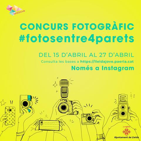 LleidaJove, la Regidoria de Joventut, ha convocat un concurs de fotografia a Instagram perquè el jovent de la ciutat hi participi explicant com viu l’actual període de confinament. El concurs #fotosentre4parets consisteix en publicar imatges que donin a conèixer quines activitats realitzen o de quina manera passen els joves aquesta situació, arran de les mesures adoptades per la covid-19. Les fotos s’han de publicar a la xarxa social Instagram amb les etiquetes #fotosentre4parets i #lleidajove.
