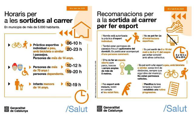 A partir de demà, dissabte, 2 de maig, s’aixequen parcialment les restriccions decretades per l’estat d’alerta arran del Covid-19 per sortir al carrer i practicar l’esport, tot i que aquesta sortida es farà en franges horàries separades per a nens, adults i majors de 70 anys i limitades per als esportistes.