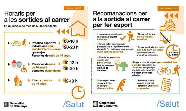 El mateix horari (de 6 a 10 h i de 20 a 23 h) regirà per als esportistes que vulguin córrer, anar amb bicicleta o similar. No tenen límit de distància, sempre que no surtin del terme municipal, però queda totalment prohibit el vehicle en aquesta pràctica.