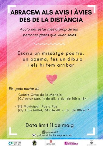 El Pla de Desenvolupament Comunitari (PDC) de Mariola, Pius XII i Escorxador han impulsat una acció comunitària per estar més a prop de les persones grans de la zona. El PDC ha promogut la iniciativa que consisteix en què infants i joves facin dibuixos, poemes o algun text amb missatges positius per a les persones grans que estan passant el període de confinament soles. Amb aquest gest es pretén donar suport i estar una mica més a prop dels avis i àvies en aquests moments excepcionals per l’estat d’alarma per la covid-19. L’acció s’obre a tothom que vulgui participar i té com a data límit el dilluns, 11 de maig.