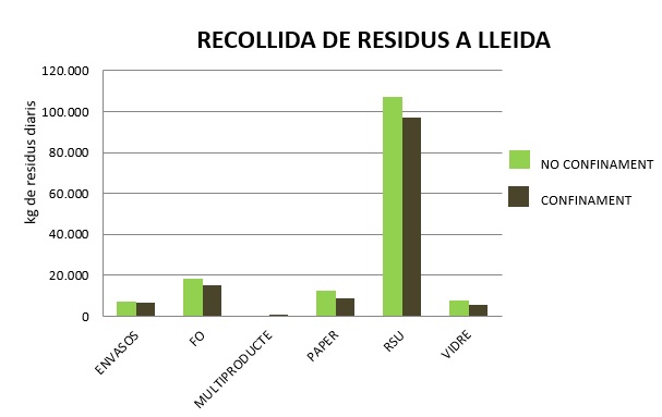 La generació de residus a la ciutat de Lleida ha disminuït durant el temps del confinament. Les dades que l’Ajuntament ha registrat fins ara indiquen un descens del 13 % del total del que es recollia els mesos anteriors. La fracció de paper i cartró és la que ha tingut una major disminució, ja que ha baixat un 29%, seguit del vidre (un 25%), la fracció orgànica (un 19%) i els envasos (un 11%). Altres indicadors sobre l’evolució de la recollida de residus durant l’estat d’alarma ha estat en la comercial a grans productors. Aquesta recollida ha disminuït per sota de la meitat a la que és habitual, un 52 per cent. Això respon a la baixada de l’activitat comercial, especialment dels establiments de l’Eix Comercial, encara que els supermercats i les botigues d'alimentació han continuat funcionant durant tot el període. També s’ha observat un lleuger descens en la recollida domèstica, que ha estat del 7%.