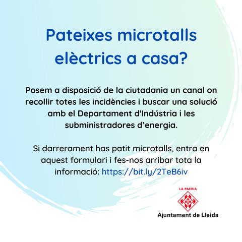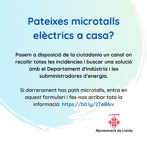L’Ajuntament de Lleida recollirà les incidències dels microtalls elèctrics que es produeixin a la ciutat a través d’un formulari que ha posat a disposició de la ciutadania. D’aquesta manera, intercedirà per buscar solucions amb les empreses subministradores i garantir un millor servei. L’objectiu d’aquesta nova eina és detectar les incidències que tenen lloc a Lleida per trametre la informació al Departament d’Indústria de la Generalitat i, si procedeix, poder-ne obrir un expedient amb la voluntat de trobar solucions i alternatives amb les empreses subministradores per evitar els microtalls elèctrics.