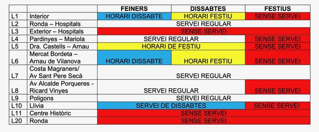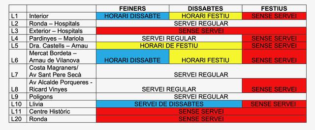 Les línies L-3 (Exterior-Hospitals), L-11 (Centre Històric) i l-20 (Ronda) romandran sense servei i les línies L-7 i L-10 tampoc tindran reforços.