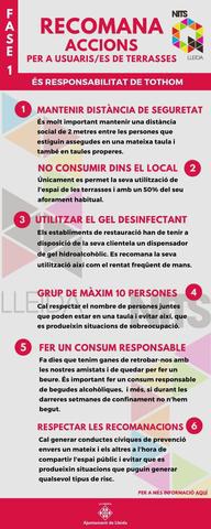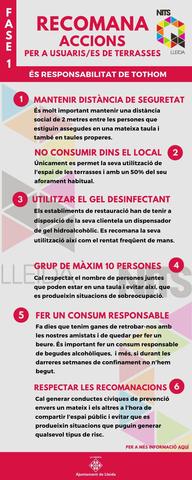 Entre altres, es recorda que cal mantenir la distància de seguretat, de 2 metres, entre les persones assegudes a la mateixa taula i/o en taules properes; que no es pot consumir dins el local –només a les terrasses i amb un 50 de l’aforament habitual-; que cal respectar el nombre màxim de 10 persones juntes, o utilitzar el gel desinfectant i rentar-se les mans sovint (per a més informació, es pot consultar Canal Salut).