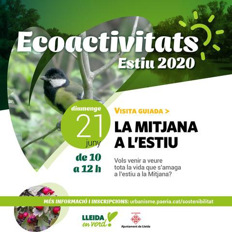 L’Ajuntament de Lleida reprèn aquest mes el programa d’activitats de natura i medi ambient Ecoactivitats, amb un ampli ventall de propostes per visitar i conèixer espais verds de la ciutat, especialment a l’entorn del Riu Segre, durant els mesos d’estiu. Les eco activitats es van aturar, de manera provisional, per la crisi derivada de la COVID-19 el passat mes de març.