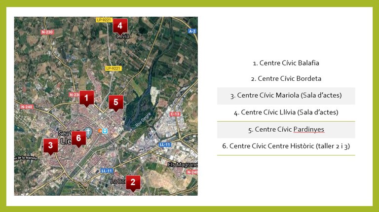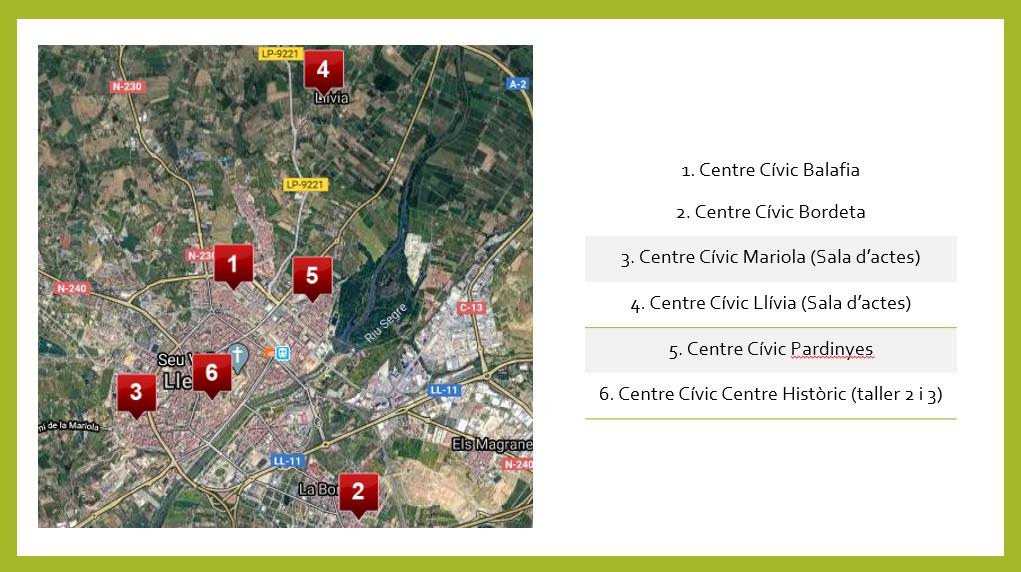 Aquesta setmana estaran oberts Mariola, Centre Històric i Bordeta. Cada setmana es valorarà les necessitats que s’han donat a cada espai per tal d’adaptar els recursos a l’activitat que hi hagi i anar utilitzant més espais en funció de les persones que ho puguin requerir.