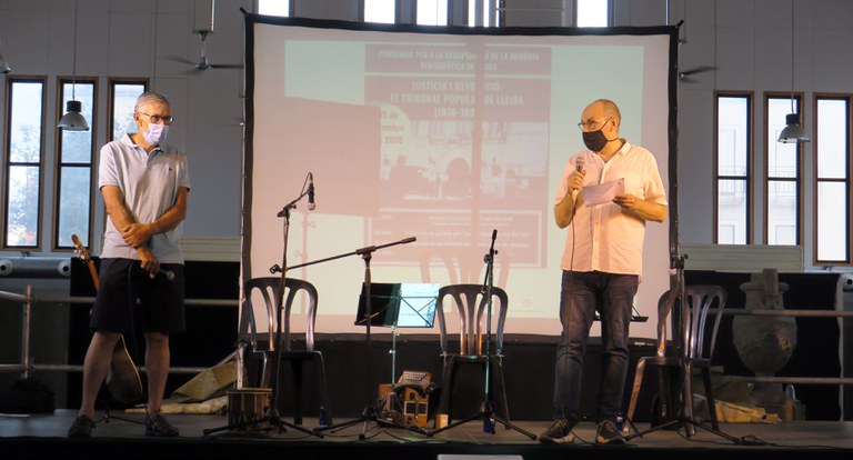 Durant l’acte, el grup Guerrilla Folk ha ofert una mostra de cançons, himnes i sons de revolta, repertori que ha donat pas a la intervenció de l’historiador Jaume Barrull, que ha anat explicant els tres espais on va tenir la seva seu el Tribunal Popular: El Palau de la Diputació, la Paeria i un edifici de la Rambla d’Aragó. Un recorregut guiat de forma virtual a través de les fotografies de Ramon Rius, que es projectaven sobre una pantalla.