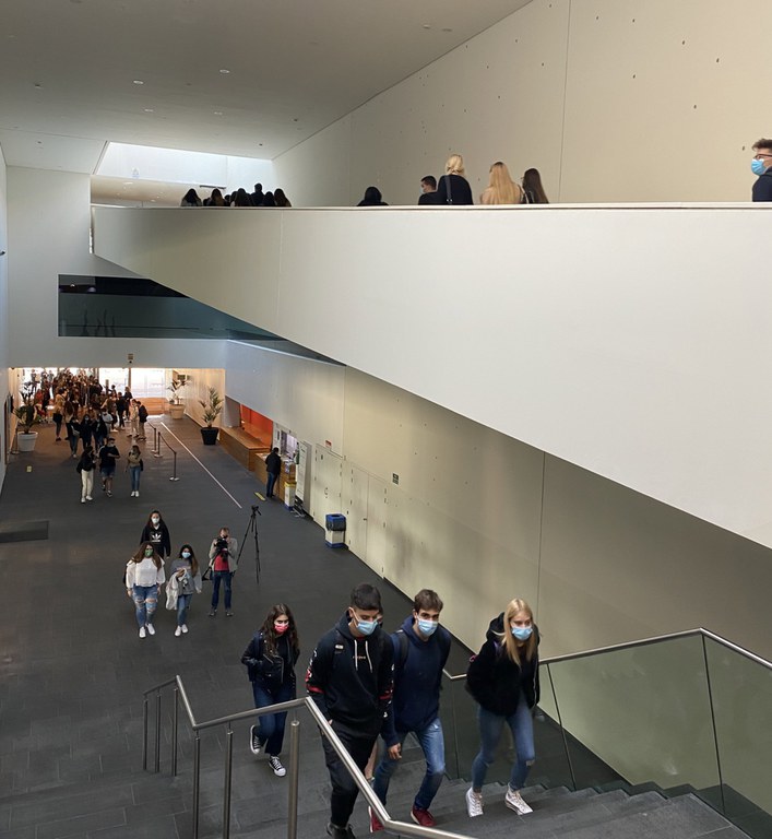 El trasllat dels estudiants de primer de Dret a La Llotja permet garantir les distàncies de seguretat i, d'aquesta manera, totes les seves classes seran presencials, un fet ara per ara poc habitual en aquests estudis donada la situació de la pandèmia. Francesc Giné i Eduard Cristóbal han remarcat que la presencialitat és importat, sobretot en el primer curs, i per aquesta raó la seva institució intenta que es pugui aconseguir al màxim.